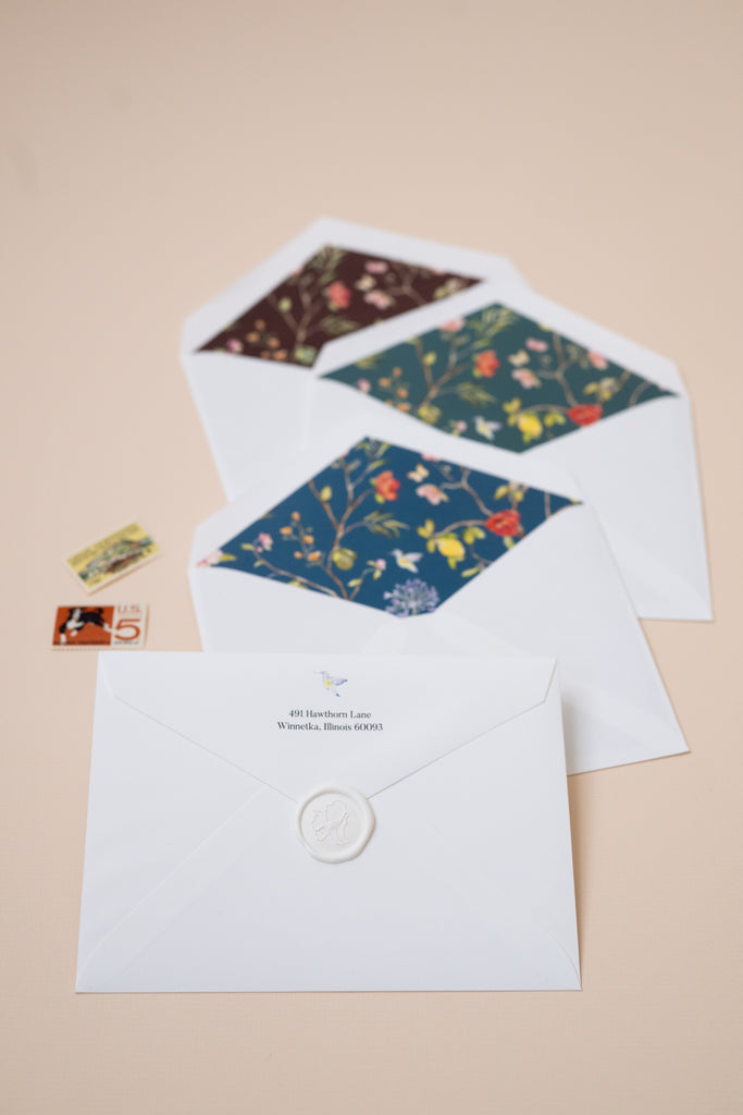 A garden-inspired wedding invitation featuring watercolor florals, botanical features, delicate branches, paired with a dark floral envelope liner for a beautiful contrast. Thoughtfully designed to feel personal, this piece sets the tone for a celebration rooted in nature with meaningful details.