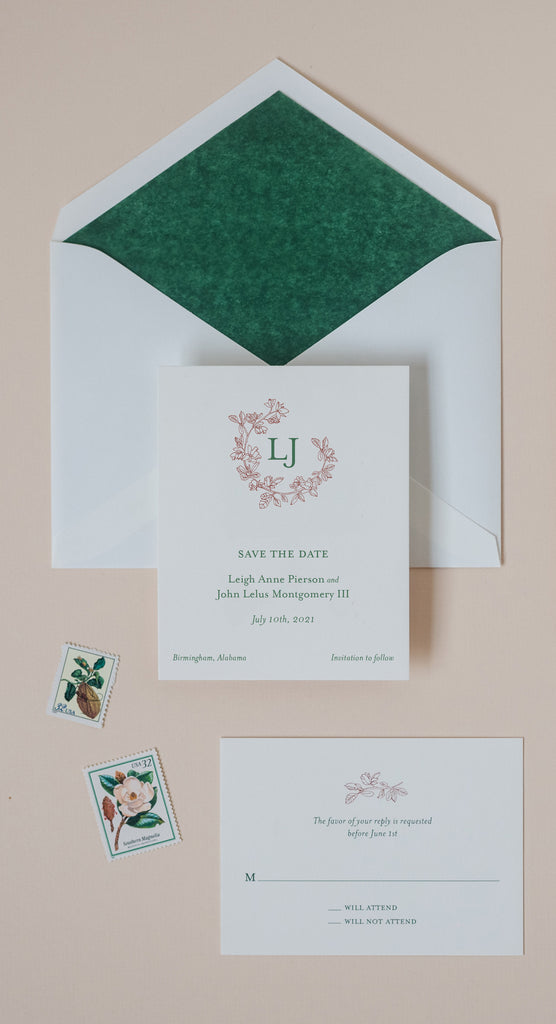 Hand-drawn floral wreath combined with a classic monogram creates classic save the dates for your wedding. Customize this terracotta and green color combination or choose your own color palette to match your wedding. Perfect for couples who love tradition with a botanical twist.
