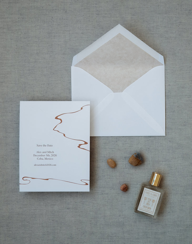 Coastal hues and subtle lines inspired by the ocean and sand evoke ocean calm and seaside elegance. Perfect for beach or destination weddings.