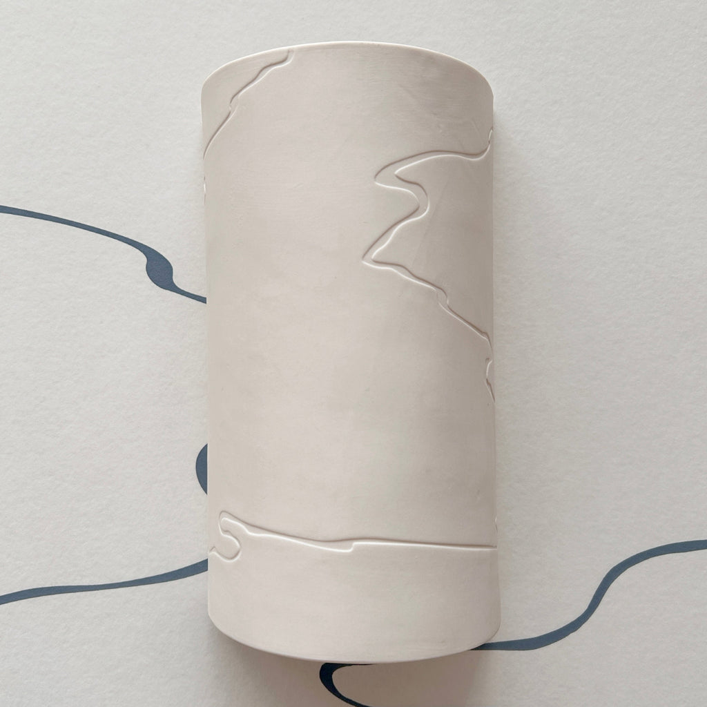 Pressed porcelain sconce. This handmade sconce allows the light to shine through and illuminate the hand-drawn designs. Available in two patterns. Made by Studio Patenaude in Chicago. Read the inspiration and more about the water project here.