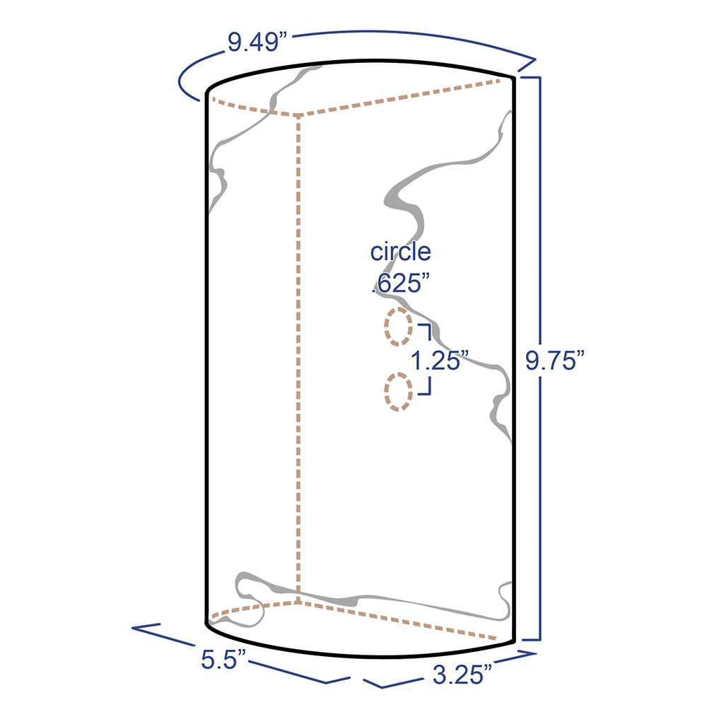 5.5" wide, 9.75" tall, 3.25" deep, half-cylindrical