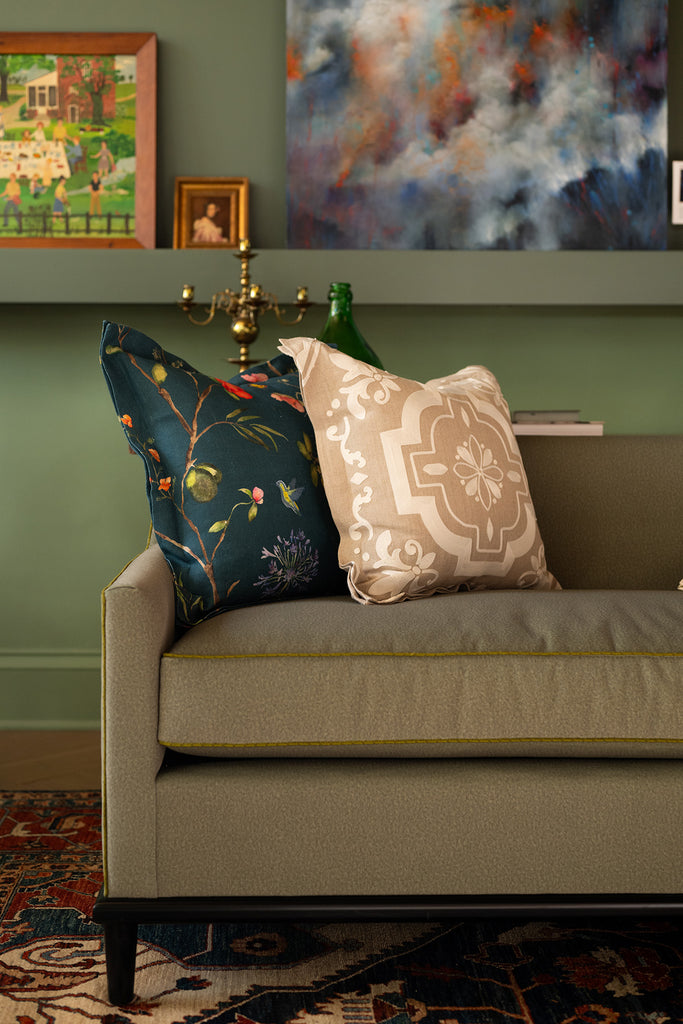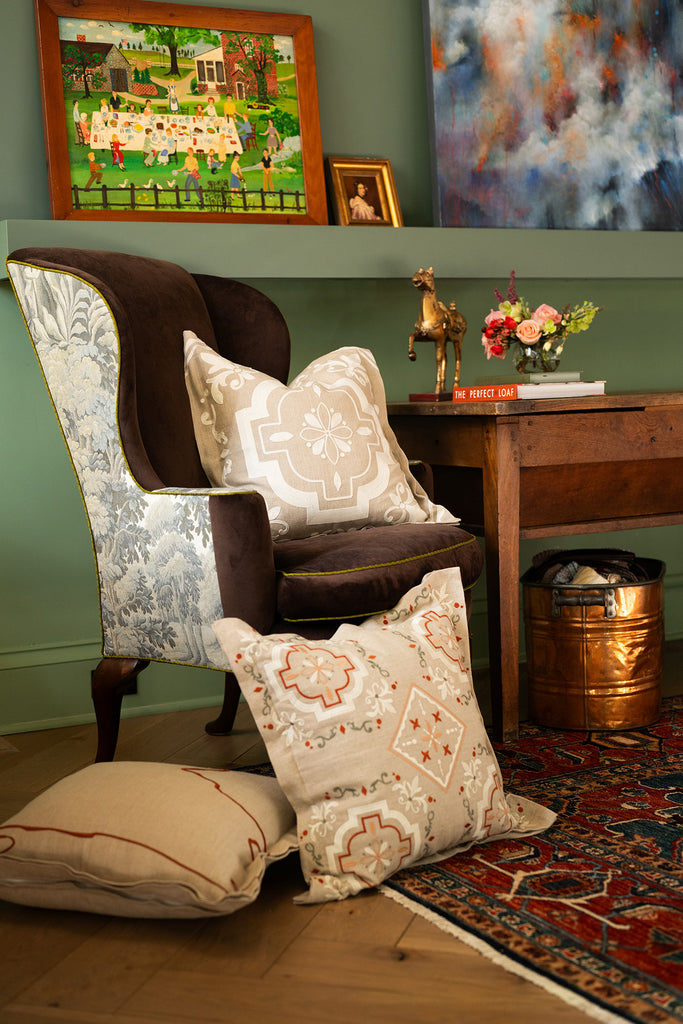 Ivory tile pattern is embroidered on this heavyweight 100% linen pillow cover with natural linen back.